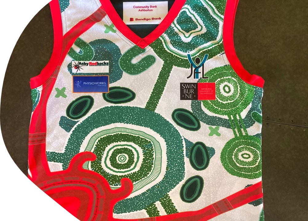 Designed by Emma MacNiell, a Yamatji Martu woman from Western Australia, the new Ashy Redbacks guernsey shows “the importance of our youth space and how youth footy plays a massive role in developing passion for the game and learning fundamental skills our children can incorporate well and truly into their adult lives”.